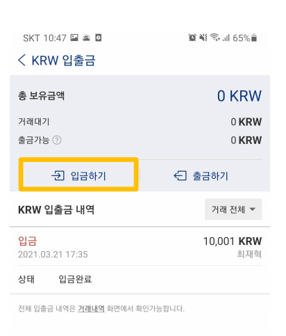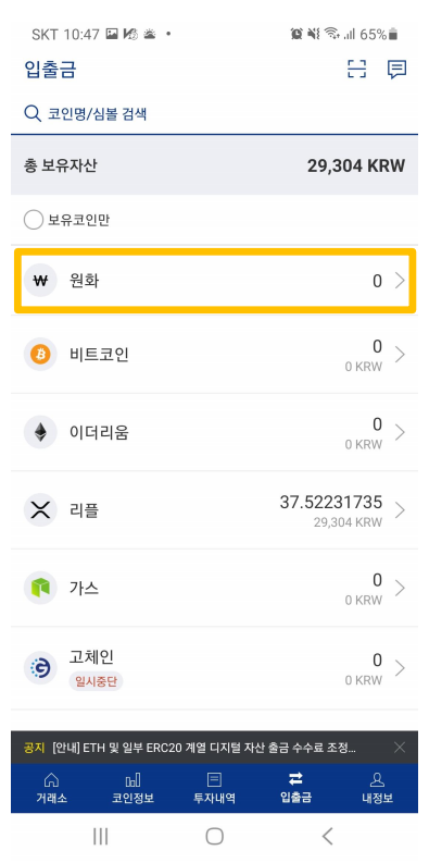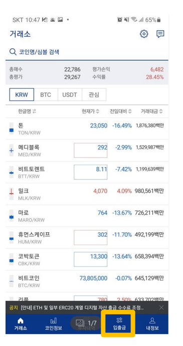 ② 업비트 첫 화면에서 아래 입출금 클릭
