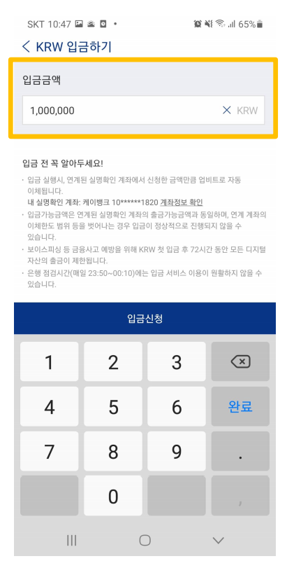 저는 100만원을 입금할 예정인데요, ①에서 말씀드린 바와 같이 100만원은 케이뱅크 계좌에 반드시 있어야만 업비트로 이체될 수 있습니다. 따라서 내 돈이 국민은행에 있다면 먼저 케이뱅크로 이체를 해둬야 합니다.