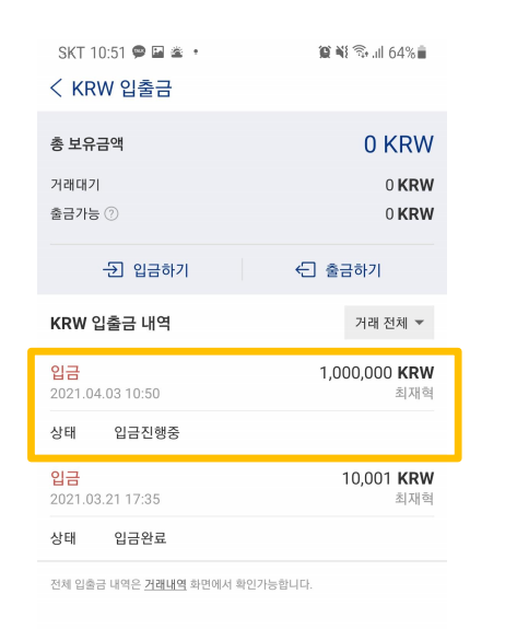 ⑦ 입금 신청이 들어가고, 입금진행중이라는 안내가 보입니다.
