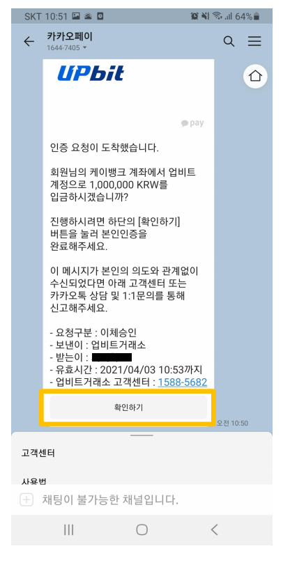 ⑧ 카카오톡 메시지로 본인확인 메시지가 오면 확인하기를 클릭합니다.